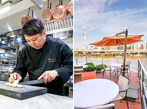 左:渡辺雄一郎シェフは恵比寿のジョエル ロブションで21年を過ごしたのち、独立。2016年7月にナベノイズムをオープンさせた。地元の要素を大胆に取り入れながら、独自の目線で組み立てた唯一無二のコースがいただける。右:2階にあるテラスからは、エッフェル塔ならぬスカイツリーが眺められる。食前のシャンパーニュをこちらで飲むことも可能。