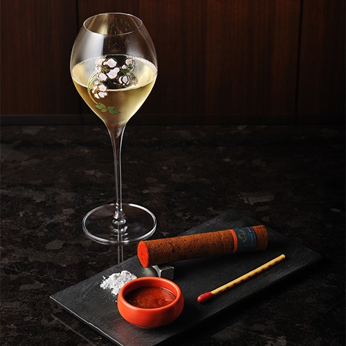 充実したフードメニューの中から、小林ソムリエが「ペリエ ジュエ グラン ブリュット」に合わせて選んだのは「ハム、イベリコのムース “葉巻”」。どこからどう見ても葉巻そのもので、これが本当に食べられるのかと誰もが驚くユニークな逸品。くるりと巻いたコーヒー風味の生地の中に、ハムとベーコンを使ったムースがぎっしり。イベリコ豚のハムとベーコンという味が強そうな素材を使っているのにもかかわらず、シャンパーニュに合うのには秘密がある。