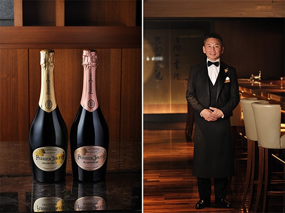 左:メゾンで最初のプレステージキュベであり、世界中の美食家から愛された「ブラゾン・ド・フランス」にインスパイアされたボトルシェイプ。細長いネックから柔らかく丸みを帯びたショルダーラインへと美しい曲線を描く。フロントラベルにはメゾンの象徴であるアネモネが描かれる。左から、「ペリエ ジュエ グラン ブリュット」ボトル¥13,970、グラス¥2,420、「ペリエ ジュエ ブラゾン ロゼ」ボトル¥21,450、グラス¥3,630 右:ザ・キャピトルホテル東急の小林博也シェフソムリエ。シャンパーニュ地方に赴き、ペリエ ジュエのメゾンを訪れたことも。
