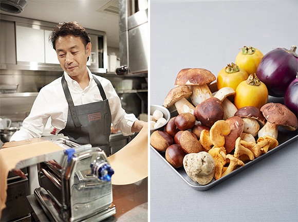 左:イタリアのみならず、フランスでの修業経験もある本多哲也シェフ。無理なく身体になじむ、軽やかで食べ心地のいい料理が好評。ベジタリアン向けのメニューなどにも対応している。右:イタリアからは白トリュフやポルチーニ茸が、日本からは福井県の吉川ナスや島根県の西条柿が届く。旬の食材をたっぷり使って季節感ある料理を提供。