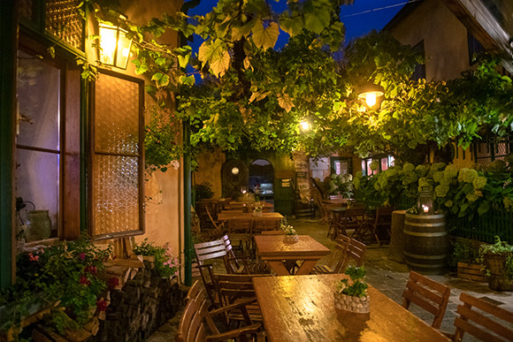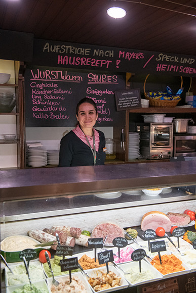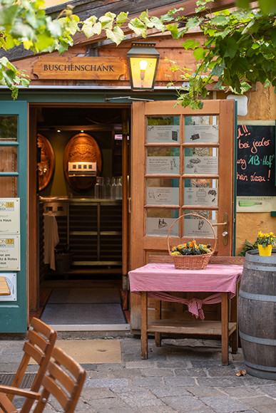 「ホイリゲ」とは「今年の」という意味で、もともとワインの造り手が新酒をつまみとともに出していたことに端を発します。ログハウスを思わせるような建物に、表のテーブルには赤いタータンチェックのクロス。ドイツ語圏的可愛さに胸打たれますね。