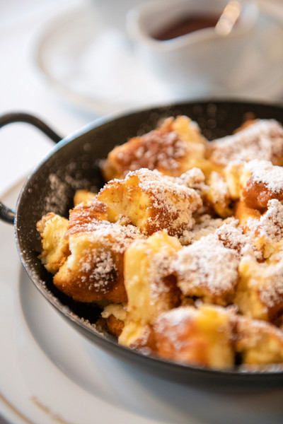 ここでいただいたのは、皇帝もワタクシも大好物なパンケーキ、「カイザー・シュマーレン」。粉糖がかかったミニパンケーキに、フルーツソースをつけながらいただきます。調べてみるとレシピは意外にシンプルなので、自分でも作ってみたいですね。タピオカ流行の次はシュマーレンかな。