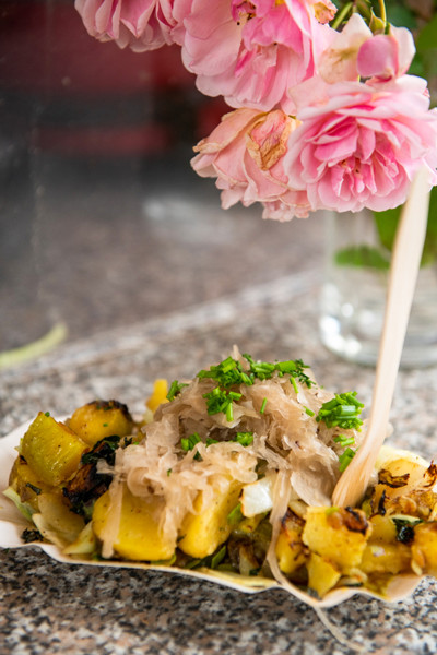 「へい、お待ち!」と出てきちゃいましたよ。まあいいか。旅もジャガイモも、人生道連れですよね。ジャガイモ&ネギ炒めに、ザワークラウト。いただきます。こりゃビールだね。