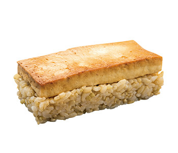 玄米にのっているのは、スパムに見立てた焼き豆腐。木綿豆腐より硬いエクストラファームのオーガニック豆腐のスライスを、醤油とみりんでほっとする味付けに。テイクアウトも可。