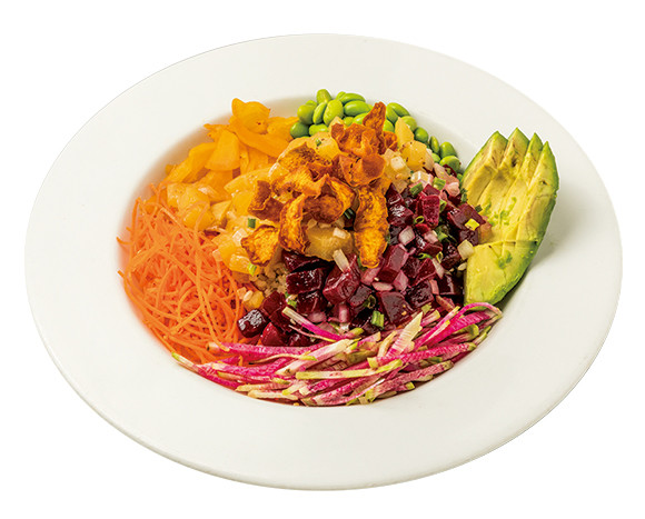 玄米の上には、マグロの代わりに赤と黄色のビーツと、タマネギ、海藻、ラディッシュ、ニンジン、アボカドなどの野菜がたっぷり。ゴマ油ドレッシングで、まんまポケボウルの味!