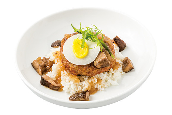 エンドウ豆から抽出したタンパク質でできた100%植物性の肉、ビヨンドミートのバーガーパテを使用。マッシュルームのグレービーソースは食べやすい和風のテイスト。