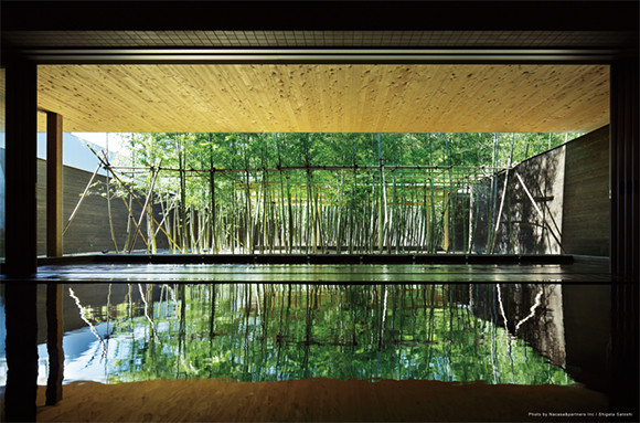 100パーセントかけ流しの片岡温泉。かすかに硫黄の香りが漂うまろやかな肌ざわりで、湯上がり後はすべすべの肌に。竹林の眺めが心地よい。