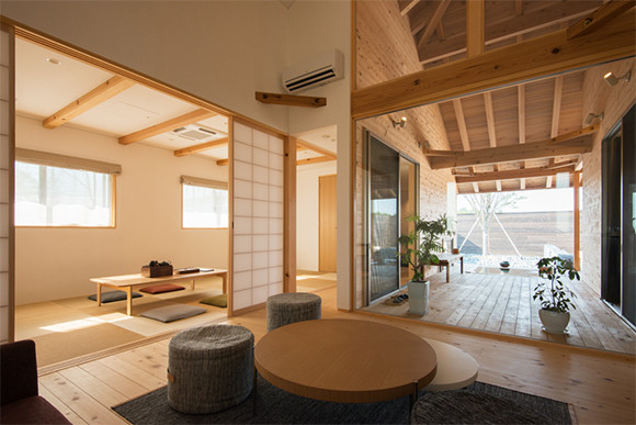 宿泊はシンプルな設計の宿泊棟と、個性的な内装の離れ宿の2タイプから選べる。写真はデッキテラスと檜の露天風呂を備えた離れ「檜」。デザイナー藤森泰司氏がコーディネートした明るい和モダンの室内でリラックス。