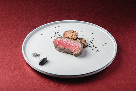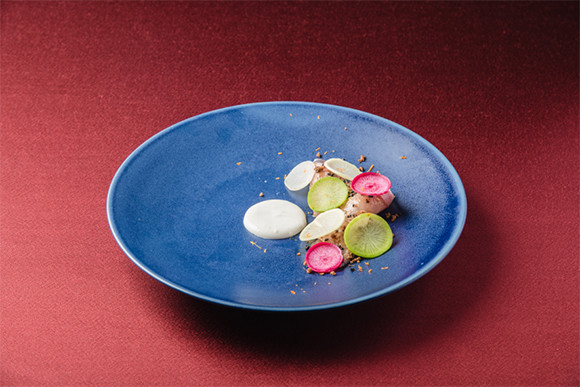 地産地消にこだわる奥田政行シェフは、敷地内の有機農園で採れた野菜と肉・魚を独自の感性により組み合わせ、創意あふれるイタリアンを生み出す。¥9,000〜13,000のコースより、伊勢のブリとカラフル大根を使ったブリ大根(左)、藁の香りを移した松阪牛(右)。
