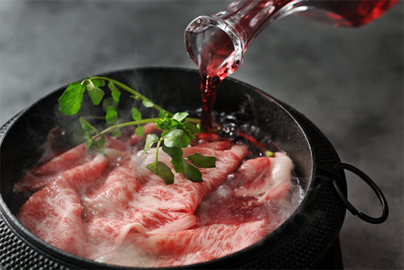 ワインと和牛を贅沢に使った「ワインすき鍋」。調理の過程でアルコールを飛ばすので、アルコールが苦手な人でもおいしくいただける。