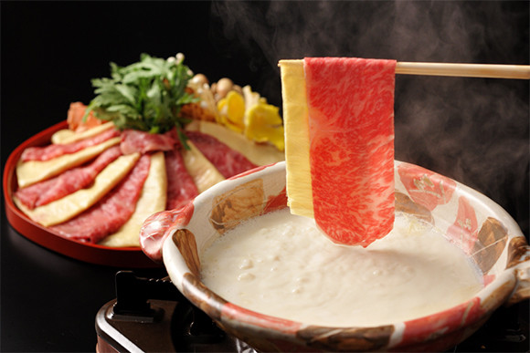 和牛と湯波を重ねて豆乳にくぐらせていただく「ミルフィーユしゃぶしゃぶ」。濃厚でまろやかな味わいが楽しめる。