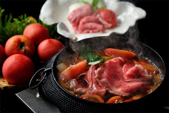 トマトの酸味と甘じょっぱい割り下、とろけるような牛肉が三位一体となった「トマトすき焼き」。温かい温泉卵を絡めていただく。