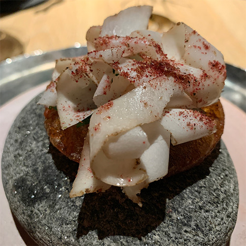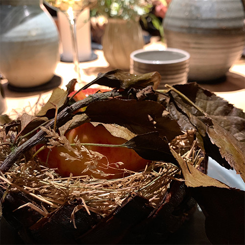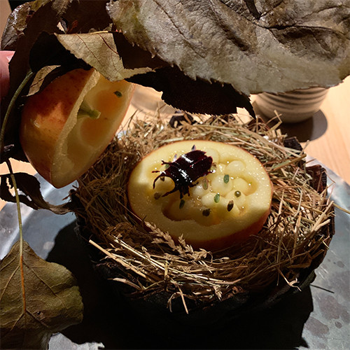 リンゴのサラダからスタート。リンゴの蓋を開けると、クワガタがいた。ブラックカラントと黒ニンニクを発酵させたもので作られたクワガタは、噛むとグジュっとした食感でニンニクが香り、本当に虫を噛んでみたらこんな感じなんじゃないかと思った。