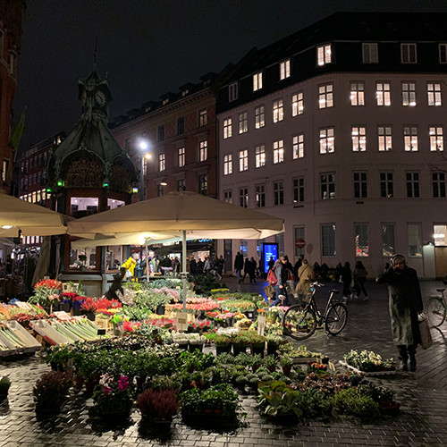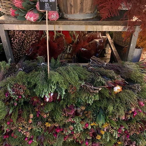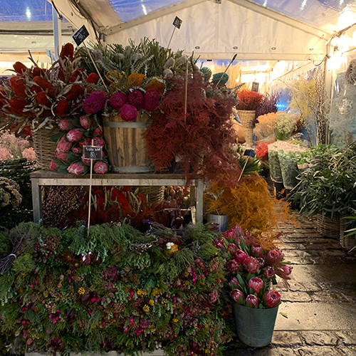 お肉屋さんの先に開ける広場には花屋さんが軒を広げていた。もう完全な夜に見えるけれど、まだ夕方16時台。この日照時間で生活をしていたら、日本やフランスで感じる以上に、花や植物の存在が大きいだろうと思う。