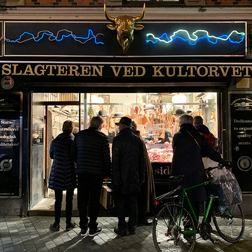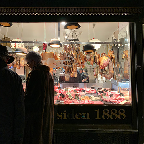 少し人がいなくなった隙に、近くに寄ってみると、吊り下げられているものがサラミ類じゃなく、豚のスペアリブとかバラ肉でもかなり大きな塊で、なんだかバイキングのいる国って感じだ。それぞれの色から、干され加減に違いがありそうなことがわかる。惹かれるなぁ。そして、それら肉塊の手前には黒い帽子がかかっていた。お店のトレードマークなのかな?と思ったら、奥に見える店員さんたちがみんな、被ってる! こんなお肉屋さん初めて見た。どうも1888年創業っぽい。