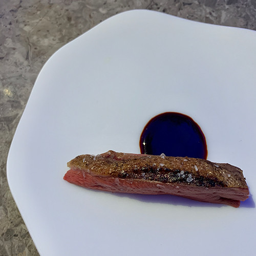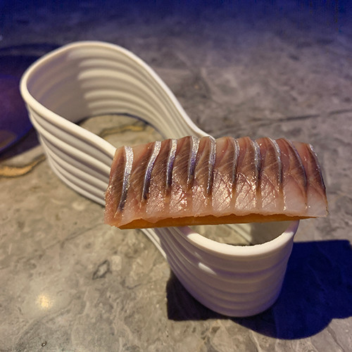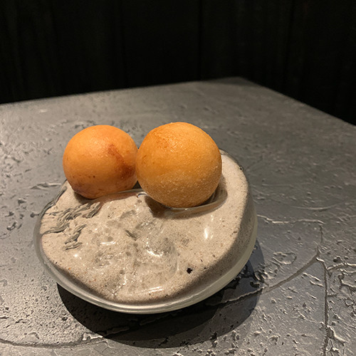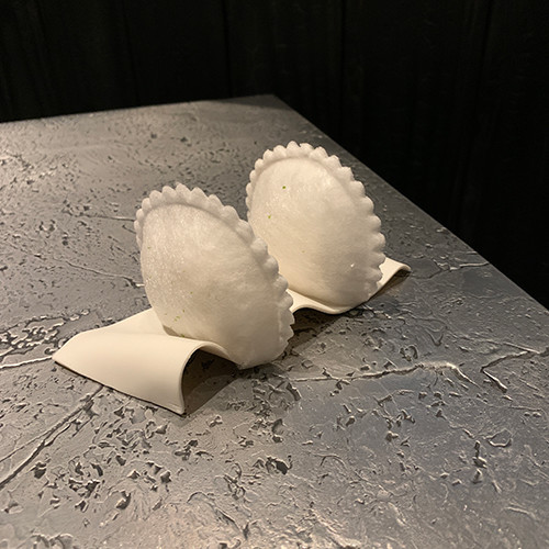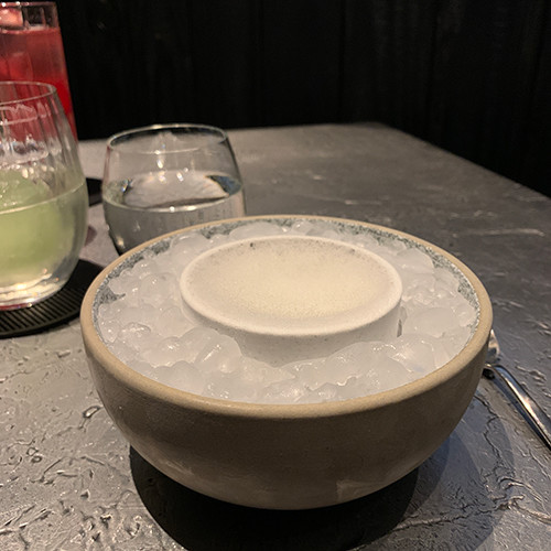 料理にペアリングするドリンクのメニューを見つつ、アペリティフを飲んでいると、最初のおつまみが運ばれてきた。空気を含んだドライアイスのようなそれの料理名は「Greed」。“貪欲”もしくは“食い意地”の意味になる言葉を充てられた白いものは硬くて、昔売っていたプラスチックの容器入りのカキ氷のようにガリガリとスプーンで削る必要があった。のに、口に含むと、あっという間に消える。溶けてなくなるほどの時間はかからない。え?こぼした?と勘違いするくらいに、口に入れたとたんにすっと消える。