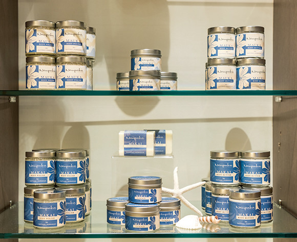 使用するオイルと同じアーシーなMauka(山・上)とフルーティなMakai(海・下)の香り。左から、スクラブ各30ドル、キャンドル各14ドル、ボディバター各34ドル、中央のソープ各10ドル