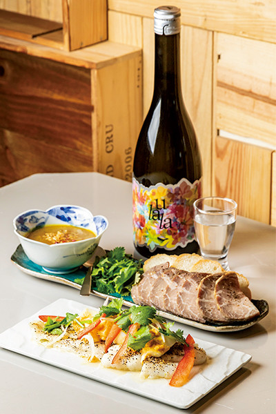 手前は「昆布締めキャットフィッシュの蒸し焼き」¥1,100。大胆に茹で卵を潰して作るタルタルソースはベトナム家庭の定番の味。奥は「茹で豚とカレーのソース」¥770。お酒は「ULALA」(グラス¥1,210)など日本酒もある。
