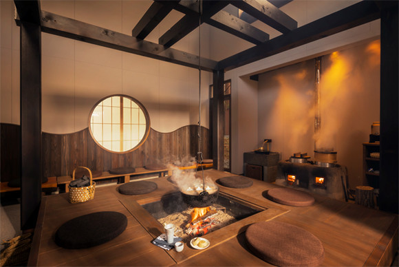 黒部立山アルペンルートの玄関口に位置する大町温泉。山並みを背景に佇む界 アルプスは、雪国のアーケード、雁木(がんぎ)に沿って両側に客室棟や温泉棟が立ち並ぶ。冬にはかまくらやかんじきを履いての雪遊び、夏には縁日や昔遊びなど信州の田舎暮らしを体験できる。敷地内にはかつての日本家屋を再現した土間や囲炉裏を設えた棟があり、こちらは滞在中、自由に利用できるスペースとなっている。パチパチと音をたてて薪が燃える囲炉裏を友人や家族と囲めば穏やかな時間に心和む。早朝はここで「おめざがゆ」がいただけるので、早起きして出かけたい。