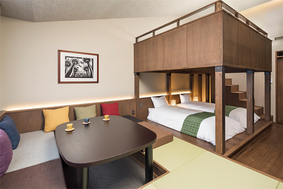 客室は伝統工芸の松崎和紙で作った行灯や切り絵作家によるアートワーク、上田紬のベッドライナーを設え、ご当地らしさを演出。ロフト付き和室には4名分のロフトベッドが備えられているので、仲間と賑やかに過ごすのにおすすめ。「寛ぎの場があることで団欒の時間が増えて絆が深まり、気が充実します。夜は部屋飲みしたり、いかに楽しく過ごすかを考えて」と李家さん。