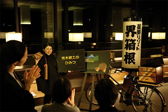 その昔、京へ向かう旅人にとって難所だった箱根の峠には、彼らが休息し、交流するための茶屋文化が発達した。界 箱根のロビーでは懐かしい紙芝居で、茶屋を中心に発達した寄木細工にまつわる物語を伝えている。お茶や駄菓子をいただきながら、昔の旅人たちの時代に思いを馳せてみては?