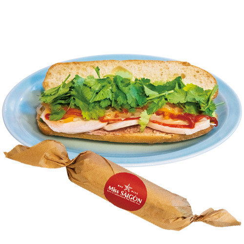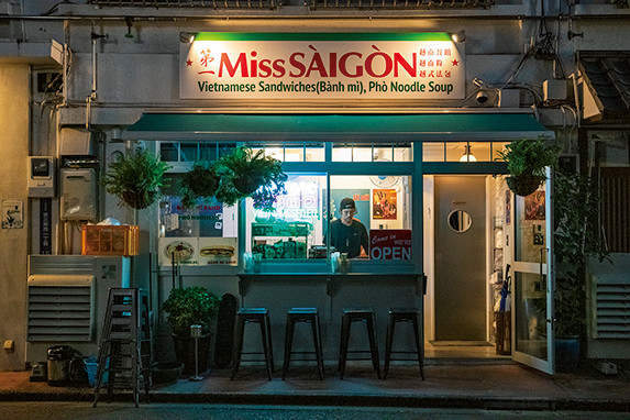 妖しげな光を放つ店の佇まいはアジアの食堂そのもの。チキンフォーや揚げ春巻きなど5種あるフードメニューの中でも人気は「バインミーサンド」(¥500)。レバーペーストになます、パクチーなど、定番具材をフランスパンに挟んだ素朴な味は深夜のおやつにも。