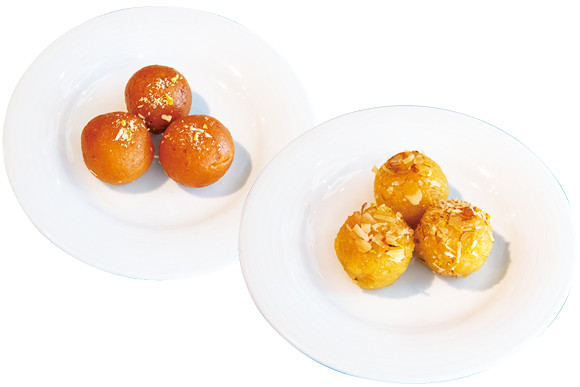 インドのお祭りごとに欠かせないミタイ。揚げドーナッツをシロップに浸した「クラブ・ジャムン」(右・1個¥220)は“世界一甘い”スイーツ。ヒヨコ豆の粉で作る揚げ玉に砂糖やナッツを加えた「ブンディラッドゥ」(右奥・1個¥198)などミタイ職人が作る伝統スイーツを。