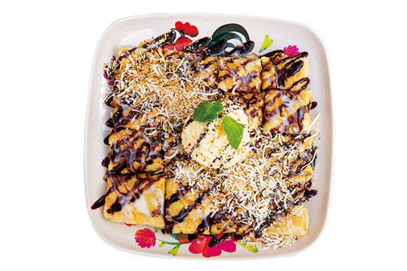現地では子どもから大人まで親しまれているタイ版クレープ。おすすめはバニラアイスやバナナ、練乳などをのせた本場「タイランドロティ」(¥700)。皮のもっちり感と優しい甘さに癒やされる。白砂糖を使わず、油もココナッツオイルを使用しているためヘルシー。