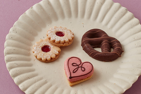 左:「テーゲベック」の中でも人気が高い花形のクッキー「ヒルダブレートレ」。バニラ風味の生地にベリージャムの甘酸っぱさがアクセント。右:プレッツェル形のココアビスケットをさらにチョコレートで包んだ「ショコブレッツェルン」はリッチな風味。下:ハート形の「ブッターゲベック ヘルツレ」は、バニラ風味のビスケット生地でヘーゼルナッツペーストをサンド。上のビスケットは、ピンク色のチョコレートでコーティング。