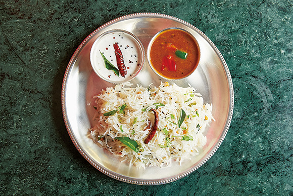 大人気の南インド料理店ダルマサーガラでディナーと週末昼に楽しめる「イディヤパム」(¥1,650)。ケララ州で定番の塩味の焼きビーフンだ。スパイス香るヒヨコ豆やウラド豆、カシューナッツは歯ごたえが小気味よく、カレーリーフとみじん切りのコリアンダーが爽やか。サンバルやココナッツチャトニーを付けて、味の変化を楽しみたい。