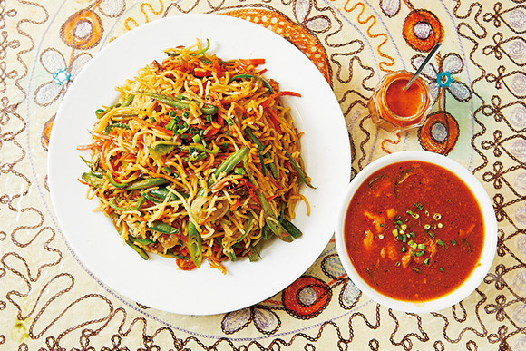 数多のインド料理店の中でも、スーリヤは「客家ヌードル」(ディナー¥1,480/前日までに要予約)を味わえる希少な一軒。細切り野菜と多種のスパイスとともに炒めたインド式中華麺は刺激的な辛さだが、醤油も使われているためか親しみやすい味。別添えの本格カレーは、麺にかけても、そのまま味わっても。