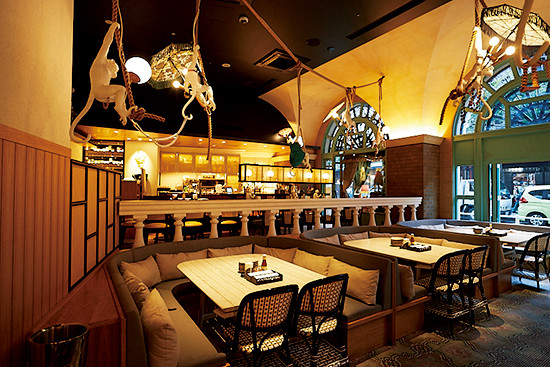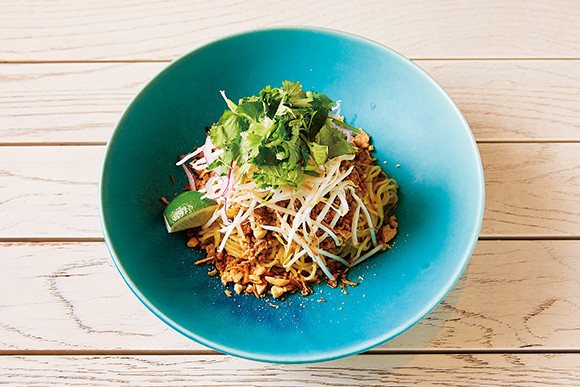 肉味噌と麺の辛味、酸味、コクが相まったパンチのある汁なし中華和え麺「バミーヘーン」(ランチ¥1,100、ディナー¥1,320)は、モヤシやパクチーなど野菜がたっぷりでヘルシー。このタイ料理店の洗練された味付けは、レモングラスやナンプラー、ガーリックビネガー、スイートチリソースなどを使った自家製辛味オイルが決め手だ。