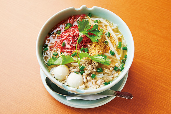 タイ語でセンは麺、レクは中ぐらい、ナームは汁を意味するとおり「センレク・ナーム」(¥1,000)は、中ぐらいの太さの麺に汁をかけた一品。具材は茹でた豚ひき肉と魚のすり身団子、桜エビ、ピーナッツなどと、冬菜という漬物が定番。豚の背ガラスープは旨味豊かで、コシのある米麺はもちっとした食感が絶妙。