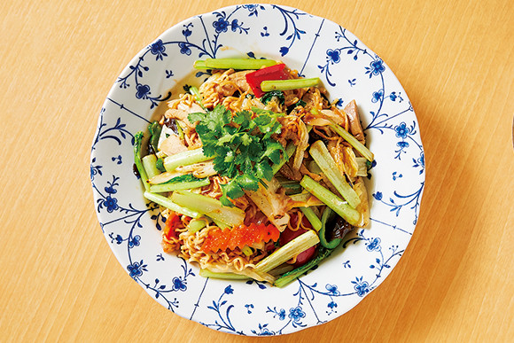 ベトナムの屋台で朝食や軽食として親しまれているという「チキン焼きそば」(¥990)。鶏肉や白菜、ニンジン、ピーマン、キクラゲなど具材がたっぷり。一見中華のようにも見えるが、ベトナムの即席麺をベトナム醤油やニョクマムで味付けした、れっきとしたベトナム料理だ。現地には麺の代わりにマカロニを使って作るバージョンもある。
