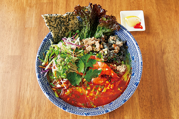 ベトナム南部の「ミーワーン」(ランチ¥970、ディナー¥1,290)は、ターメリックを練りこんだ黄色いフォーが特徴的。トッピングのゴマせんべいがスープでふやけていく食感の変化も楽しい。ほかの具材は豚ひき肉とキクラゲの炒め物、エビ、ピーナッツなど。特製ラー油が、塩味のスープにアクセントを添えている。