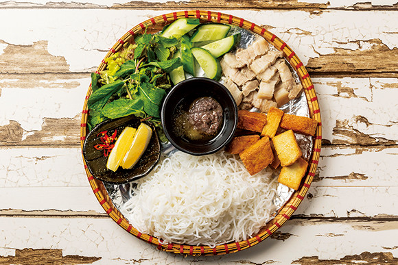 ベトナム北部のご当地麺といえば、小エビを発酵させた塩辛のような調味料(マムトム)に麺と具材を付けて味わう「ブンダウマムトム」(¥1,045)。キーとなるマムトムは、ベトナム産の厳選品を使用。レモンを搾って唐辛子を加えてよく混ぜ、少しずつ麺に付けて食べてみて。料理名はそうめんのような米麺(ブン)と揚げ豆腐(ダウ)に由来。