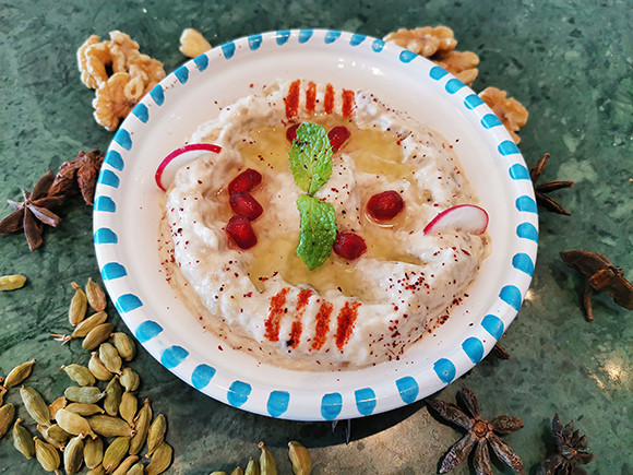 モルディブ有数の絶景を誇るラグジュアリーリゾート「シーサイド・フィノール」。海辺のオープンキッチンレストラン「ハーバー・グリル」からは、ナスをたっぷり使う一品をご紹介。ムタッバル、あるいはババガヌーシュと呼ばれるこの料理、現地では大きなナスを使うけれど、日本では、日常的に手に入る小ぶりなナスを使ってOK。タヒニは白ゴマペーストで代用可能。身近な材料だけで、中東発祥の伝統的な味を再現できるのがうれしい。