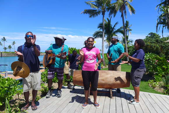 リゾートへは、ナンディの港から専用の高速艇で約40分。ママヌザ諸島のマロロ島は、エメラルドに輝く海の美しさで知られる離島。桟橋では、フィジアンのスタッフたちが、笑顔とアップテンポの音楽で迎えてくれて、リゾート気分がぐんと盛り上がります。