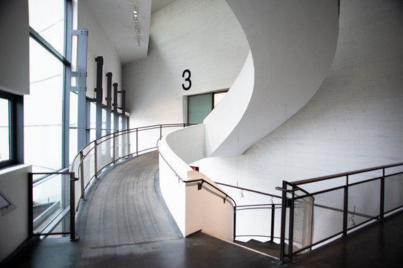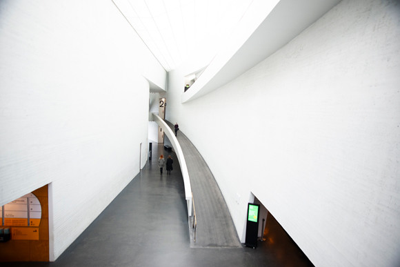2階から3階へと向かう階段とスロープ。この美術館には中2階がいくつかあり、階段も地階から最上階を垂直に結ぶ構造を持たない入り組んだフロア構成になっていて、迷路を歩き回るような建築的な楽しさもある。