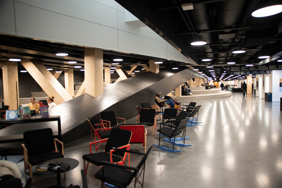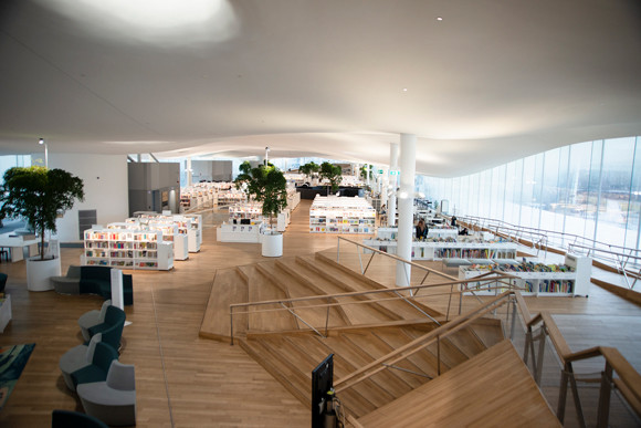 ヘルシンキ現代美術館から徒歩4分ほど、通りを挟んで斜め向かいにも特徴的な現代建築の建物がある。ヘルシンキ中央図書館「Oodi(オーディ)」だ。フィンランドの設計事務所ALAアーキテクツが設計を手がけ、2018年12月にオープン。2019年夏には、国際図書館連盟(IFLA)によって2019年公共図書館賞で最優秀賞に輝いた。