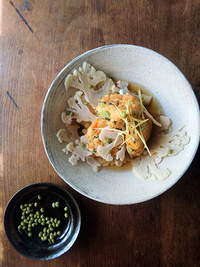 翌日は、出汁をひいて、スライサーで薄切りしたカリフラワーと一緒に温めて、ショウガの千切りと実山椒を散らします。