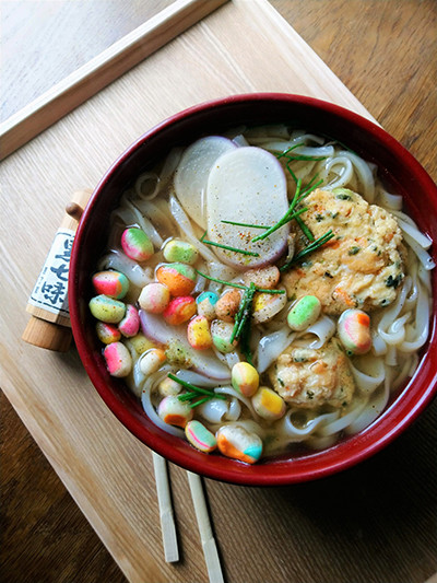 数日後、冷凍にしておいたものを、うどんにのせていただきます。出汁を吸ったがんもどきと稲庭うどん、七味を効かせると、これも本当においしい。