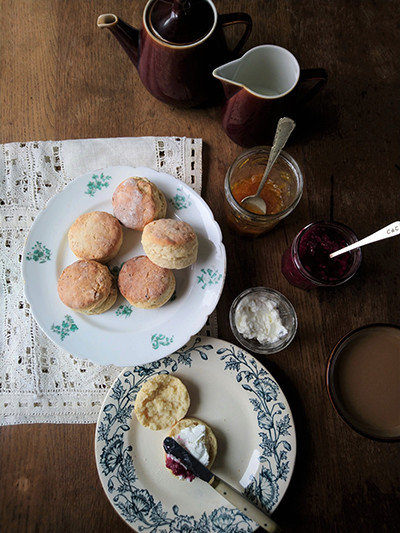 このスコーンは、小麦粉にベーキングパウダー、砂糖少々、オレンジの皮、ヨーグルトとオイルを入れて焼いたもの。クリームチーズの代わりに、ヨーグルトをコーヒーのペーパーフィルターに入れ水分を切って使っています。自家製のマーマレード、ラズベリーのコンフィチュールは、旬の頃にキビ砂糖を少しだけ入れ、サッと煮たものを冷凍保存しています。