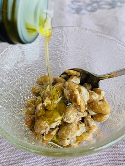 納豆を朝食にする時は、オリーブオイルが欠かせない。それも、たっぷりと。マイルドなタイプより、少しピリッとする味のオイルを合わせ、塩や醤油、添付のタレなど、味付けはその時の気分で。オリーブオイルをかけた納豆は、箸ではなくスプーンで食べます。ご飯を合わせることはあまりなく、単品、あるいは薄切りトーストにのせることも。