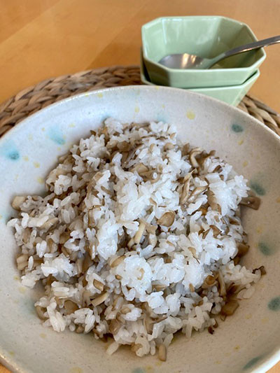 昼は舞茸ライス。舞茸を1cm程度に、適当に(本当に適当で大丈夫)切って、オリーブオイルと塩で炒めます。水分が出てきたらそれがなくなるまで炒めて、置いておく。これを炊き上がった白いご飯に混ぜるだけ。塩が足りなければここで調整。冷蔵庫に入れて冷やしてもおいしい。ライスサラダとして副菜になります。