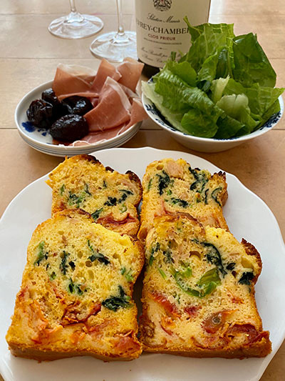今晩はワインを飲みたい気分。前菜には、昼間焼いたケークサレを。具にはセミドライトマト、冷凍ホウレン草、鮭の瓶詰めを利用したので、生地を作るだけ! 見かけよりもずっと簡単にできます。塩気の多い生ハムには、カリウム摂取の目的もあって、必ずフルーツを添えます。今日はドライプルーン。