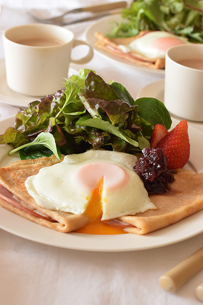 1日目に続いて、この日も全粒粉のガレット。ガレット生地が五分通り焼けたらハムと好みのチーズをのせて半分に折り、空いたフライパンのスペースで目玉焼きを焼いてうつわに盛ります。前回紹介したタマネギの赤ワインジャムも添えて。