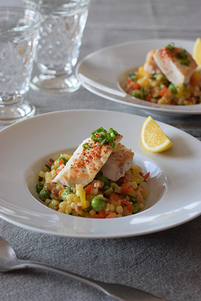 ランチはフレゴラのリゾット。フレゴラとは、イタリア・サルデーニャで生まれた粒状のパスタ。炒ってあるので芳ばしい香りが特徴です。茹でておいてものびないところがとても便利。タマネギやグリーンピースなど、その時にある野菜を炒めて、茹でたフレゴラと合わせます。今日はソテーしたカジキマグロをのせて、エスプレット(トウガラシの粉)を振りかけました。フレゴラはスープやクリーム煮などにしてもおいしいです。