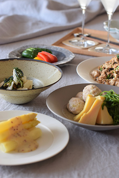 ランチに炭水化物をいただいて、夜は摂らないスタイルが多いです。この日は宮城県の純米吟醸酒に合うお料理をいくつか。手前から時計回りに、ホワイトアスパラガスをソテーして西京味噌とグレープフルーツのソースをかけたもの、ワラビと長芋の金山寺味噌和え、ぬか漬け、豆腐と黒ニンニク、ザーサイ、パクチーを炒めたもの、そして新タケノコと鶏団子、豆苗煮。