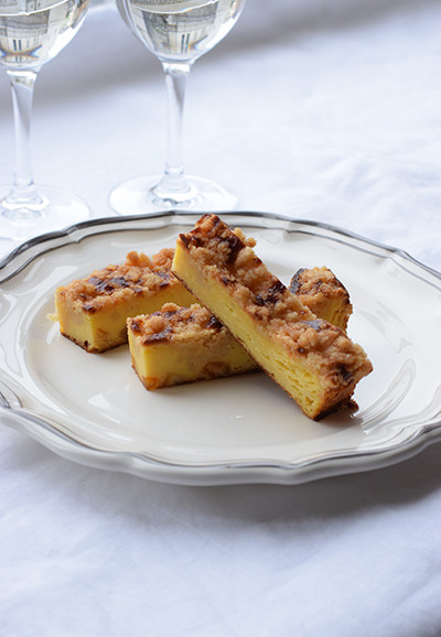 ゴルゴンゾーラを使った、甘じょっぱいお菓子。表面にはクランブルを振りかけて食感にアクセントをプラスしました。ワインや食後酒ともよく合います。レシピは18㎝の角型で作っていますが、お手持ちの耐熱バットや型を使ってお好みの形に。冷やしてもおいしいです。